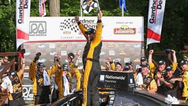 Brendan Gaughan survived two early incidents and a race track dampened by rain for most of the second half as cars drove on rain tires to win the Gardner Denver 200 Fired Up By Johnsonville at Road America.