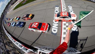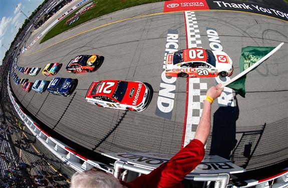 Matt Kenseth, driver of the #20 Circle K Toyota, and Ryan Blaney, driver of the #21 Motorcraft/Quick Lane Tire & Auto Center Ford, take the green flag to start the Monster Energy NASCAR Cup Series Toyota Owners 400 at Richmond International Raceway on April 30, 2017 in Richmond, Virginia. Photo by Brian Lawdermilk/Getty Images.