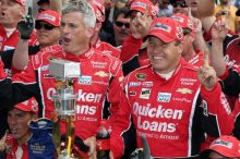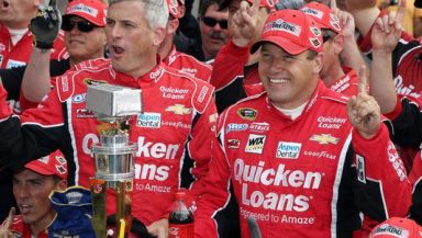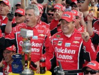 Borland made the gutsy two-tire call with just eleven laps left in the race to score the kissing of the bricks for his driver and the team of the No. 39 Quicken Loans/The Smurfs Chevrolet.