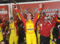 Denny Hamlin looked to have made the winning pass when he pulled out from behind race leader Ryan Newman and made inside pass for the race lead exiting turn four on the last lap. But Newman came down the track to block, sending Hamlin below the yellow line, thus per NASCAR’s rules, Hamlin advanced his position and was disqualified for going below the out-of-bounds line.