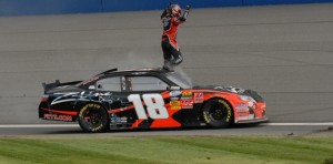 [/media-credit]Kyle Busch will be the first to tell you that he stole his latest win in the NASCAR Nationwide Series last Saturday at the Auto Club Speedway. The truth of the matter is he won the Royal Purple 300 following a gutsy, hero or zero, two tire stop call by his crew chief Jason Ratcliff in the final laps of the event.