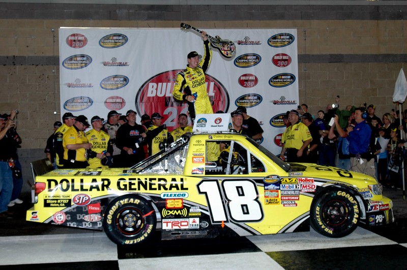 Kyle Busch won the Bully Hill Vineyards 200 in dominating fashion, leading 140 out of 150 laps en route to his team’s third Camping World Truck Series victory in five races in the 2011 campaign, along with his second straight victory in sponsor Dollar General’s backyard. “It was a really good race.” said an ecstatic Kyle Busch. “The guys at the shop did a great job and brought a great piece of equipment out here to the track. The clean air really helped us out most of the race and with about ten to go, Hornaday got a jump on us on the restart and got along-side of our spoiler and took a little air off of me and got around us, but we got a caution and we thought we were in a good position on the restart. So we did the same thing that Hornaday did on the previous restart and we got a good run on him in turns one and two and sailed by him in turn three. It would have been a shame had we lost today. The guys worked so hard, and our pit-stops were great and we wored really hard to come away with the win.”