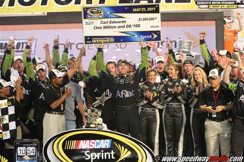 [/media-credit]Edwards’s machine struck a man-hole in the front-lawn destroying the machine. This is Edwards’s first win in the All-Star race. In an impromptu victory lane due to the car’s post-race condition, Edwards exclaimed ‘We just won a million dollars! It’s unbelievable!” And while the team celebrates Jack Roush offered Edwards a chance to work on the car, after all “anytime you have grass on the windshield after the race it’s not good.” Edwards said. He will also be declining Roush’s offer as he heads to Iowa to compete in Sunday’s Nationwide race.
