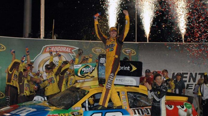 [/media-credit]With his second win of the weekend, Kyle Busch took the honors for the Inaugural Quaker State 400 NASCAR Sprint Cup race at Kentucky Speedway. The win marks his 22nd Cup series win and his third of 2011, pushing him into the points lead.