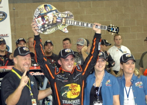 HOORAH for those very beautiful. and very special, trophies presented to the Nashville Super Speedway winners. They are of course those beautiful guitars customed painted by Sam Bass, the official artist of NASCAR. Over the years I’ve spend a significant amount of time making my living in show business. I fully understand the feeling of owning and playing one of those fine, hand crafted, Gibson Les Paul Guitars. Add to that the beauty of a Sam Bass painting and it’s no wonder these guitars are the most sought after trophies in NASCAR racing.