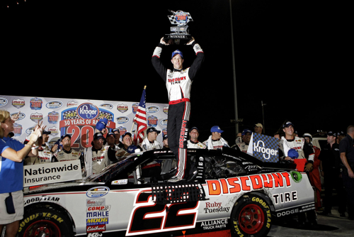“We ended up restarting in second position on the outside lane and I knew that if I could get around the 6 car that we had a shot at the win. I had a great short-run car that could give Ricky (Stenhouse Jr.) a run for his money. If the race was two of three laps longer, I’m sure Ricky would have drove around us. Our Discount Tire Dodge Challenger was great on the short run. It’s great to get back to victory lane again.” Keselowski said.