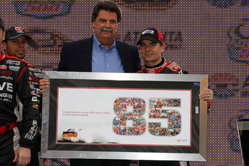 [/media-credit]Jeff Gordon helped himself to another 3 Chase bonus points and he and Jimmie Johnson put on a show at the end Tuesday. Gordon held his team-mate off for the 85th win of his career and now sits third alone on the all-time list. Also locked in and in line for a run at the season crown are Carl Edwards, Kevin Harvick, Matt Kenseth, Ryan Newman, and both Busch brothers. With his three wins this season, you can add Brad Keselowski to that list with a guaranteed wildcard. That is, if he needs it.