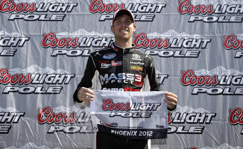 [/media-credit]Denny Hamlin scored his third career pole here at the Phoenix International Raceway in the Nationwide Series and his fourth career front row start. He will start alongside defending NASCAR Nationwide Series Champion, Ricky Stenhouse Jr.