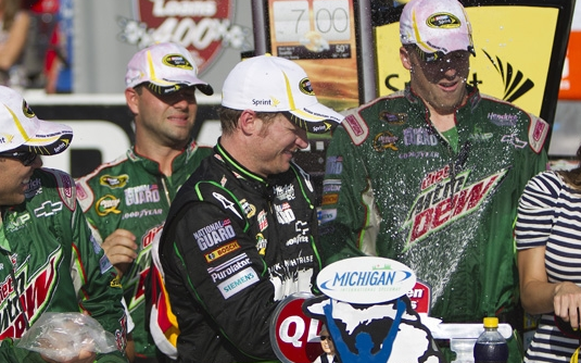 After the cycle of pit stops, on lap 171 Earnhardt Jr. regained the lead by almost 2 seconds and was able to build up a lead of 5.393 seconds in route to his 19th career Sprint Cup series victory. Earnhardt Jr’s last win was here at Michigan on June 15, 2008.