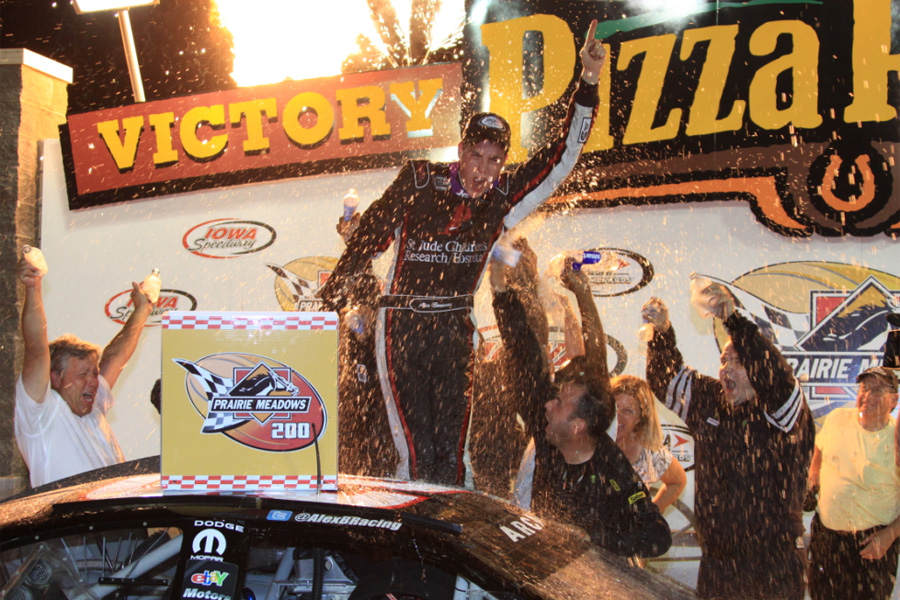[/media-credit]Alex Bowman would hold off Grant Enfinger on a late race restart to win the Prairie Meadows 200 at Iowa Speedway. It marks Bowman’s third win of the season as he became the seventh different driver to pull into victory lane on the short track.