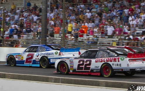 [/media-credit]The caution flagged waived on lap 78 in Saturday’s inaugural NASCAR Nationwide Series race at Indianapolis Motor Speedway. Sadler was in the second spot for the restart, lining up the No. 2 Chevrolet on the outside of race leader Brad Keselowski.