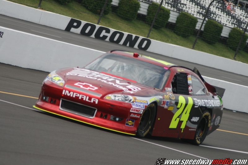 [/media-credit]Finally, one name has been missing from the list of those who appeared to be in contention for the 2012 NASCAR Spring Cup title. Now, all is right with the world. After winning in Pocono on Sunday, Jeff Gordon is back. When Jimmie Johnson went for a wiggle, he took himself out of the hunt for the day, ditto for Matt Kenseth, and any thoughts Denny Hamlin might have retained got smashed. However, it allowed Gordon to squirt through on the inside with Kasey Kahne behind him. The caution came out, the thunder boomers returned, and the race ended.