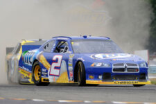 Busch started to slip around heading down hill into turn one and that allowed Keselowski to catch him. By the time they were in turn two Keselowski was there and going up the esses Keselowski got into Busch spinning him out. That wreck cost Busch a race everyone thought he had won. Busch did manage to get going again and finish in the seventh position. After Busch was out of the way, Keselowski was the leader followed by Ambrose who was close in tow. Going into the inner loop, both Keselowski and Ambrose started to slip in the oil and both ran off course in the inner loop but managed to stay close to each other entering turn five.