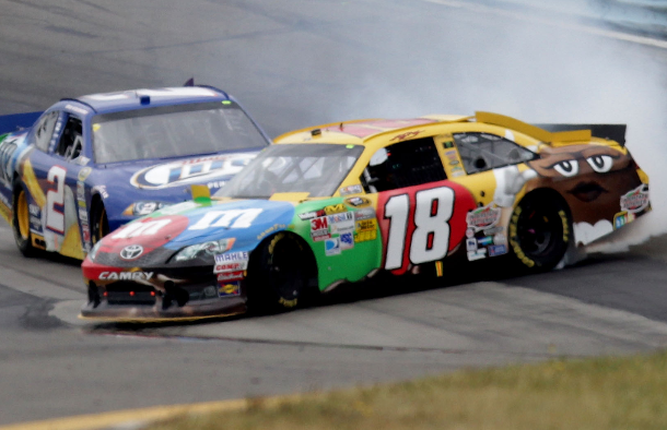 The tide was just about to turn. Bobby Labonte blew up crossing the start finish line and no caution was thrown by NASCAR. Really? All of a sudden, Marcos Ambrose and Brad Keselowski began to close in on Busch significantly. Something had also broke on the No.18 car according to Keselowski which had begun leaking even more fluid on the race track. Busch went wide going into turn 1 and heading into turn 2, Keselowski made contact with the No.18 which sent him around and into the wall. Ambrose and Busch then duked it out for the win slipping and sliding in all the fluid.