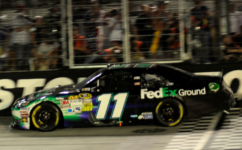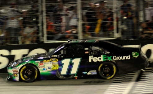 [/media-credit]After three previous races during the first weekend on the “new” Bristol surface, everyone was still uncertain what the annual Bristol night race would bring to the NASCAR Sprint Cup series. Denny Hamlin found the right groove, was in the right position, and drove a great race to get his third win of the season and his first at the famed Bristol Motor Speedway.