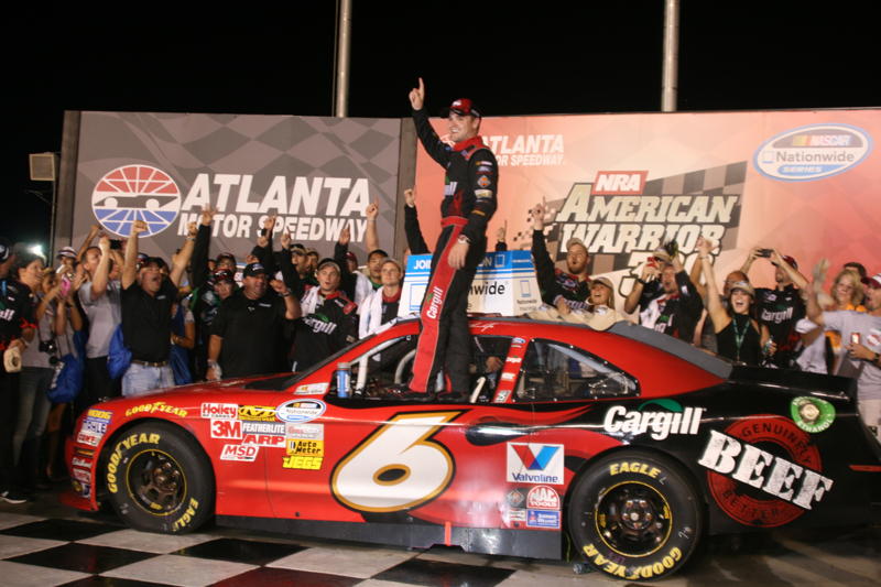 [media-credit id=99 align=”alignright” width=”225″][/media-credit]Ricky Stenhouse Jr. won the NASCAR Nationwide Series (NNS) NRA American Warrior 300 at Atlanta Motor Speedway. Stenhouse passed Kevin Harvick with one lap and half to go to win his fourth race this season and his first race at Atlanta.