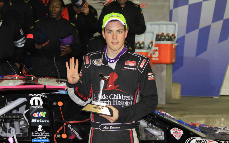 [media-credit name=”ARCARacing.com” align=”alignright” width=”320″][/media-credit]Alex Bowman would take the lead with 15 laps to go in a thrilling three-wide pass by Grant Enfinger and Brennan Poole and never look back, taking the win in the Kansas Lottery 98.9 for his fourth victory of the season.