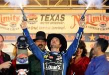 [/media-credit]Jimmie Johnson led 168 laps and won from the pole for the second week in a row at Texas Motor Speedway on Sunday. Johnson restarted on the outside of Brad Keselowski on the final green-white-checkered restart. Johnson made the pass and pulled away while exiting turn-2 and held onto the lead for the final laps.
