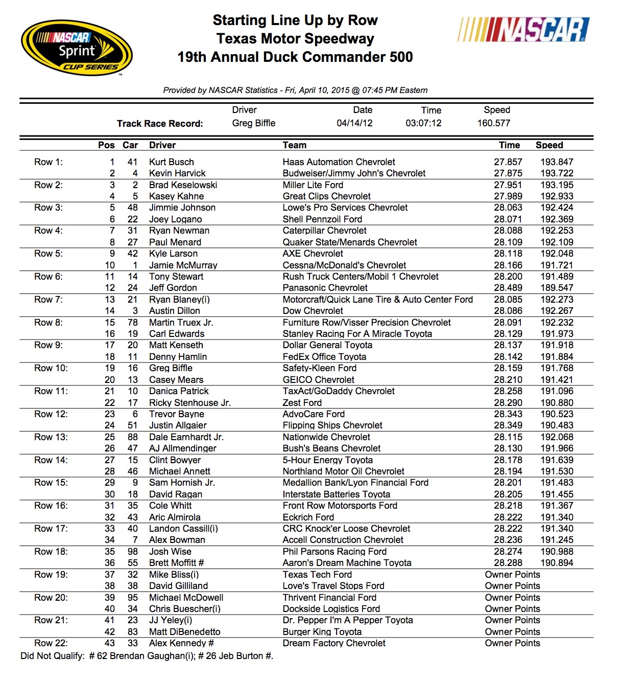 Brad Keselowski (No. 2 Miller Lite Ford) qualified third at 193.195 mph and was followed by the Hendrick Motorsports duo of Kasey Kahne (No. 5 Great Clips Chevrolet) at 192.933 and Jimmie Johnson (No. 48 Lowe’s Pro Services Chevrolet) at 192.424 mph.
