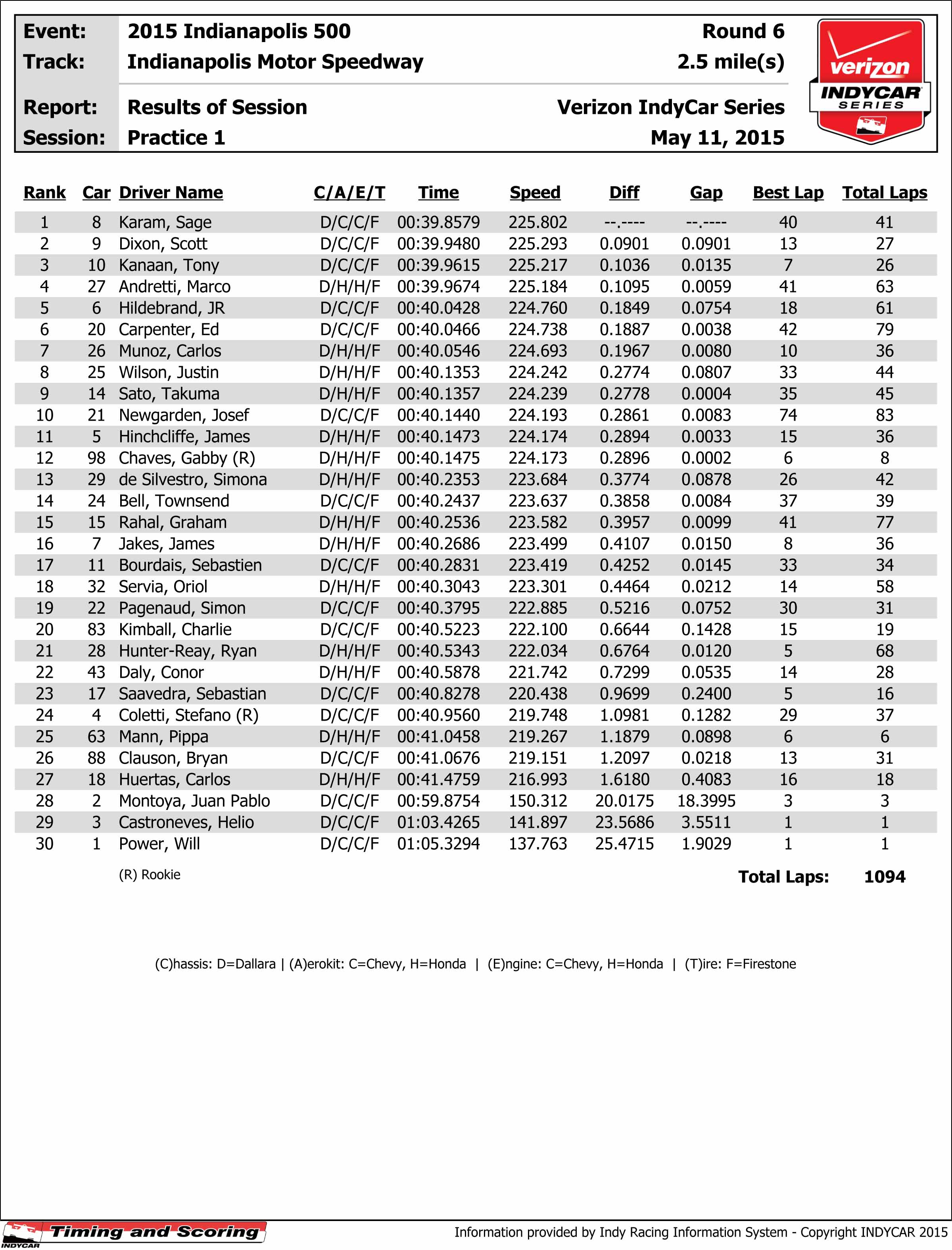 2013 Indianapolis 500 winner Tony Kanaan rounded off the CGR sweep, 0.1036 seconds off of his rookie teammate.
