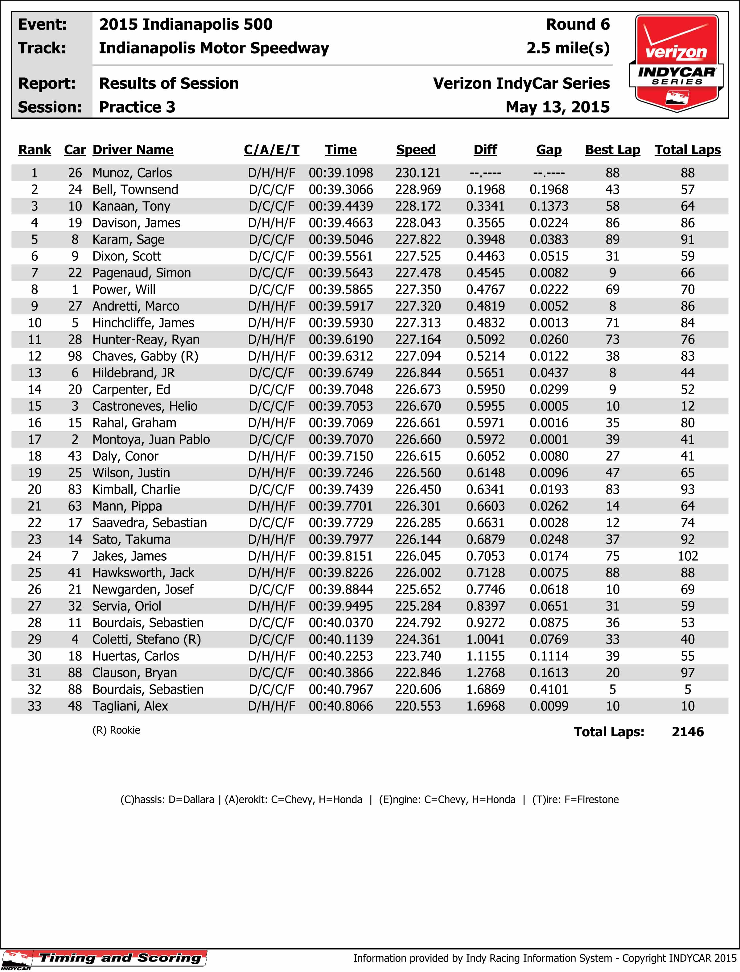“I think the ability of the team in five hours to put that (back-up) car together – we had to take the engine out of one car and take a lot of the pieces off – and get out for a few laps says a lot,” Roger Penske commented. “It looks like we’re competitive; we ran 226 (mph). To me, it’s a good start for tomorrow.”