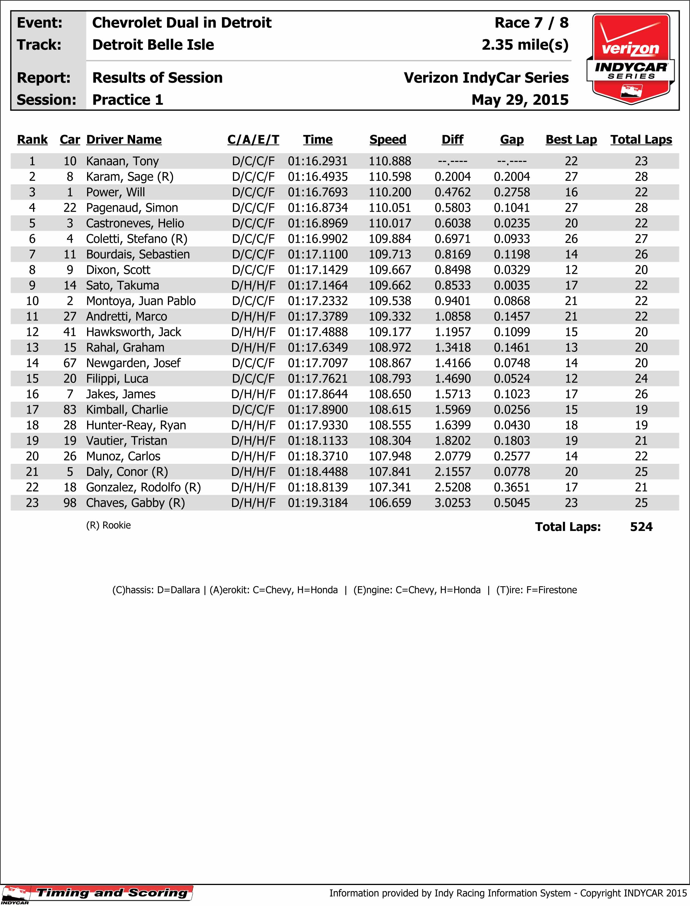 In Friday practice for the Chevrolet Duel in Detroit, it would Tony Kanaan topping the charts with a lap of a minute and 16.2931 seconds.