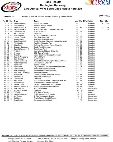 Denny Hamlin won the 33rd Annual VFW Sports Clip Help a Hero 200 Saturday afternoon at Darlington Raceway, claiming his 14th series victory in 152 XFINITY Series starts. It marked his third victory and eighth top-10 finish in 2015.