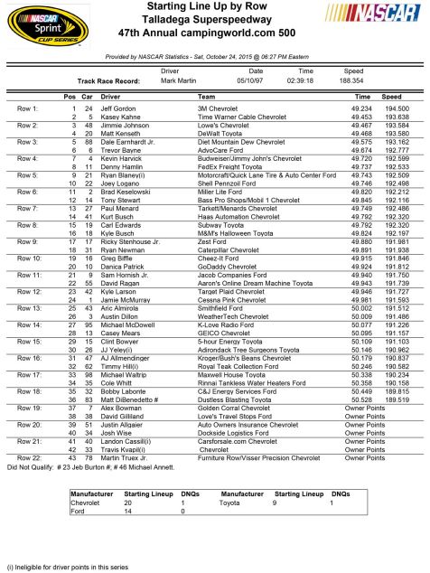 Gordon toured the 2.66-mile oval in 49.234 seconds (194.500 mph) to earn his fourth Coors Light Pole Award of the season, his fifth at Talladega and the 81st of his career. Gordon has claimed the top starting spot for all three 2015 restrictor-plate races for which the pole was contested—the Daytona 500 and both Talladega events.