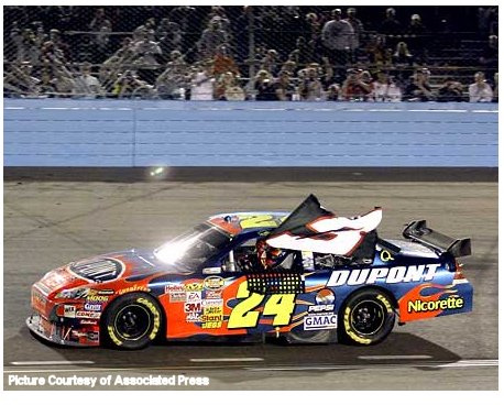 Fast forward to 2007, Gordon wins his 76th race at Phoenix International Raceway. A crew member hands him a No. 3 flag that Gordon held while doing a victory lap of the circuit.