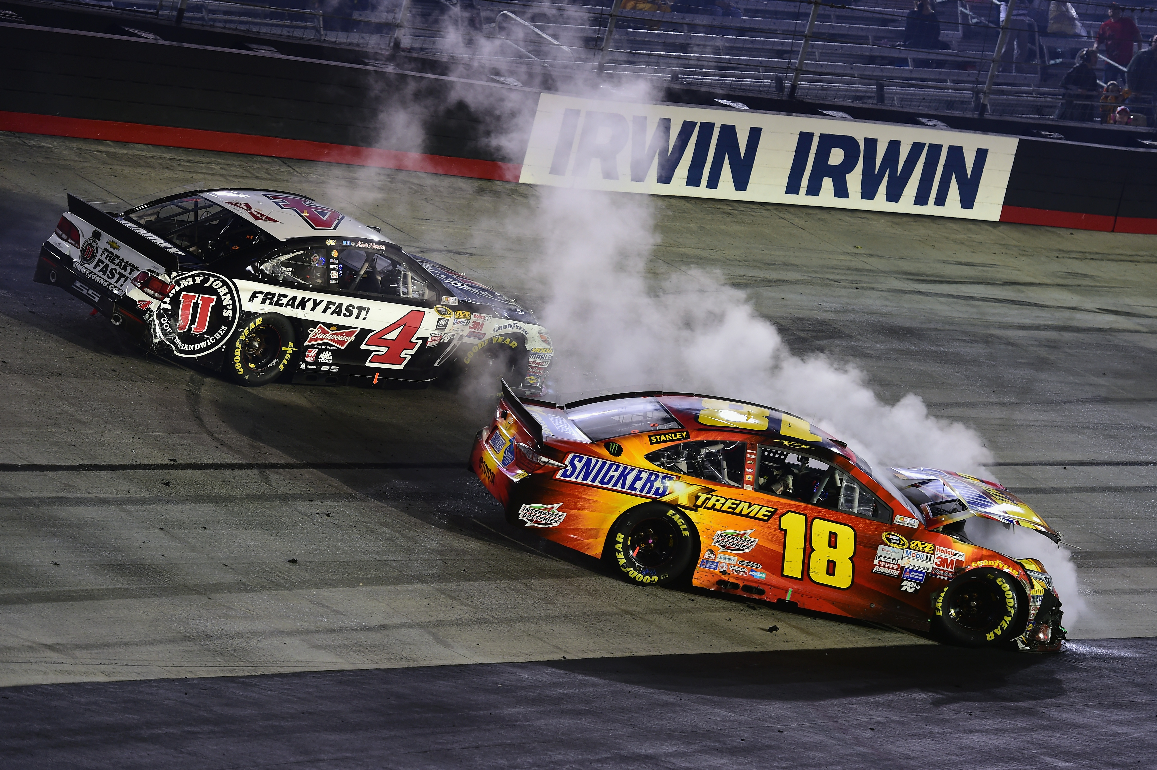 Then on lap 310, David Ragan, who was driving in place of the injured Kyle Busch, made contact with Jeb Burton in Turn 1. Kevin Harvick was unable to avoid him and t-boned the side of the No. 18 Joe Gibbs Racing Toyota.