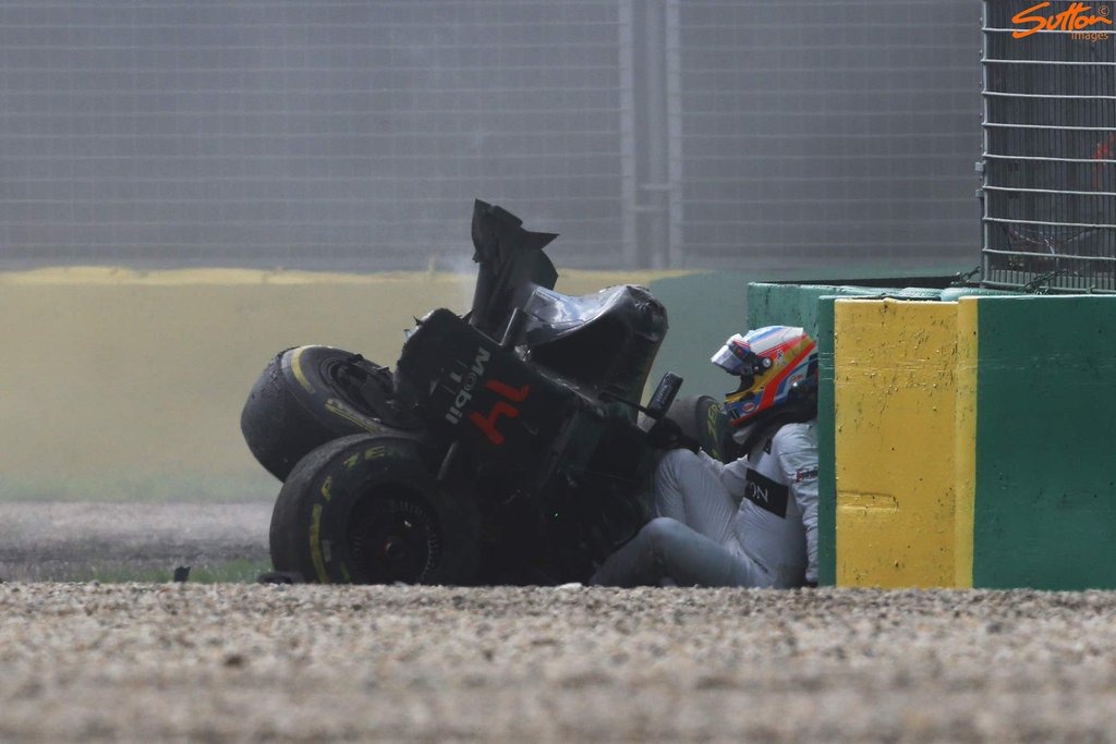 Fernando Alonso extracts himself from his destroyed McLaren Honda. Photo: Sutton-Images