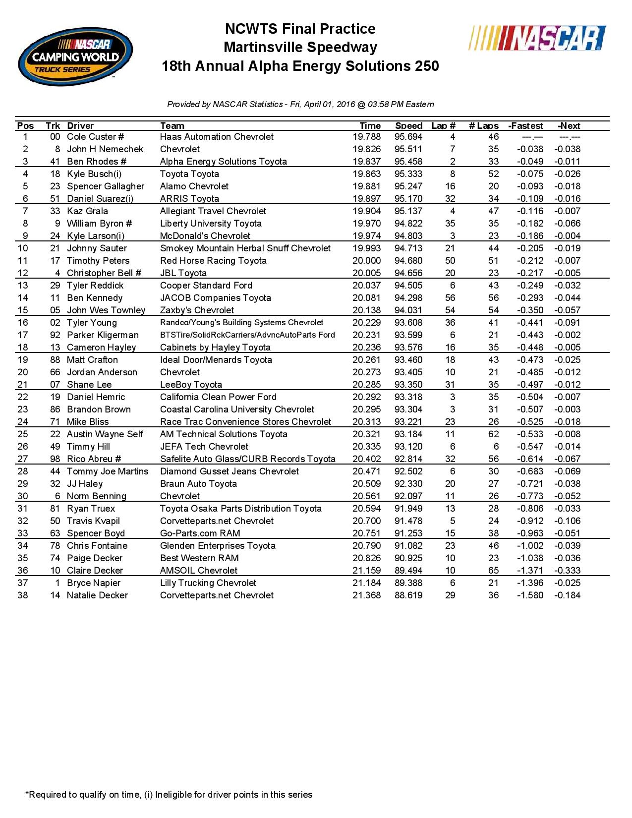 MARTINSVILLE, Va.– In case you missed it, Cole Custer topped the chart in final Camping World Truck Series practice at Martinsville Speedway.