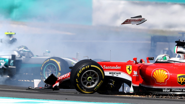 Sebastian Vettel suffered race-ending damage after contact with Nico Rosberg in turn 1 on the first lap of the Malaysian Grand Prix. Photo: Clive Rose/Getty Images