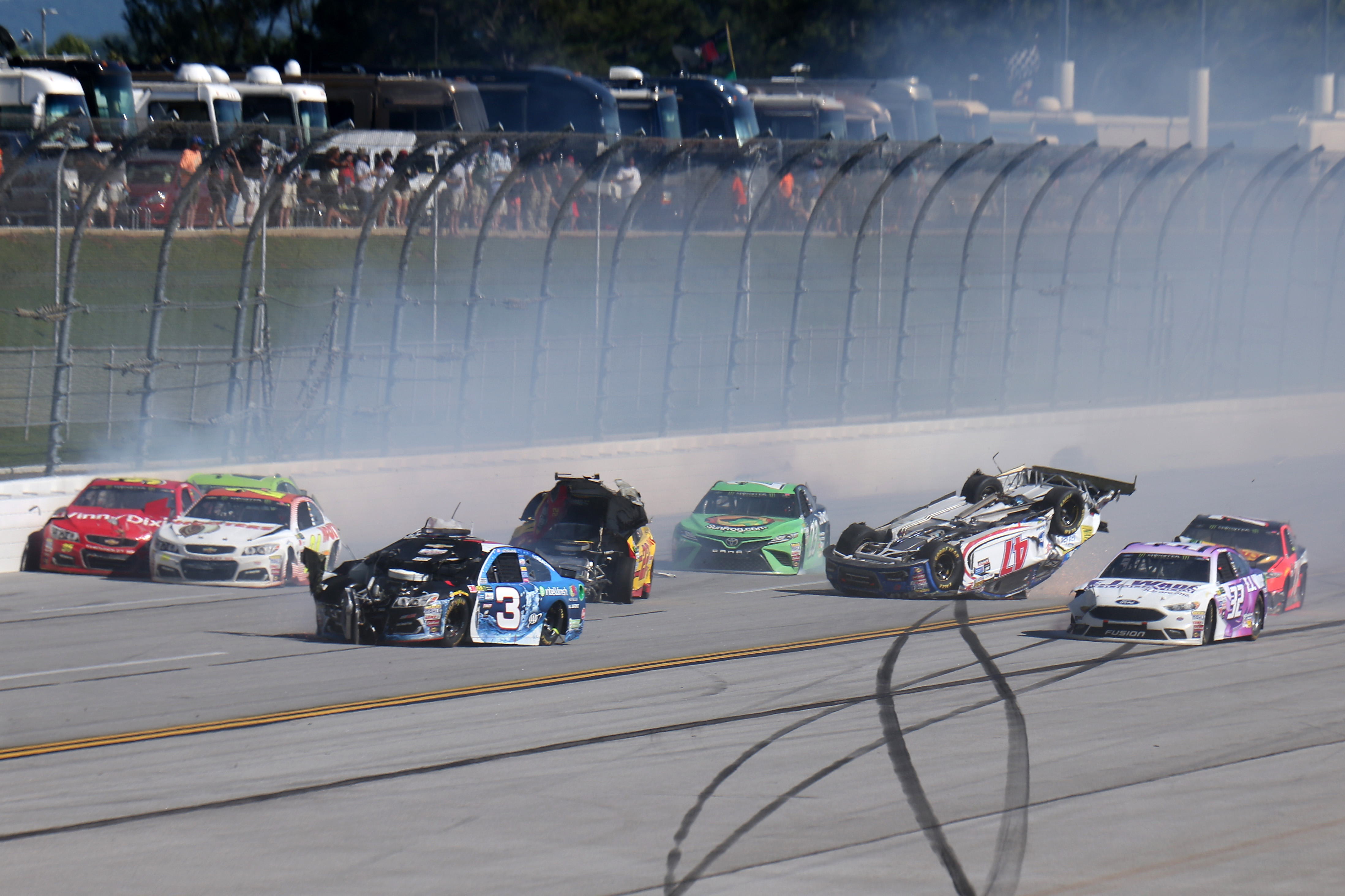 Other collected included Danica Patrick, who came down across the nose of Matt DiBenedetto and slammed into the jutted out opening of the inside retaining wall, Harvick, who spun up the track and sideswiped the outside wall, Martin Truex Jr. and Trevor Bayne, who both t-boned the passenger side of Logano’s car, and Austin Dillon, who slammed into the rear-end of Matt Kenseth’s car driving through the smoke of the wreck.