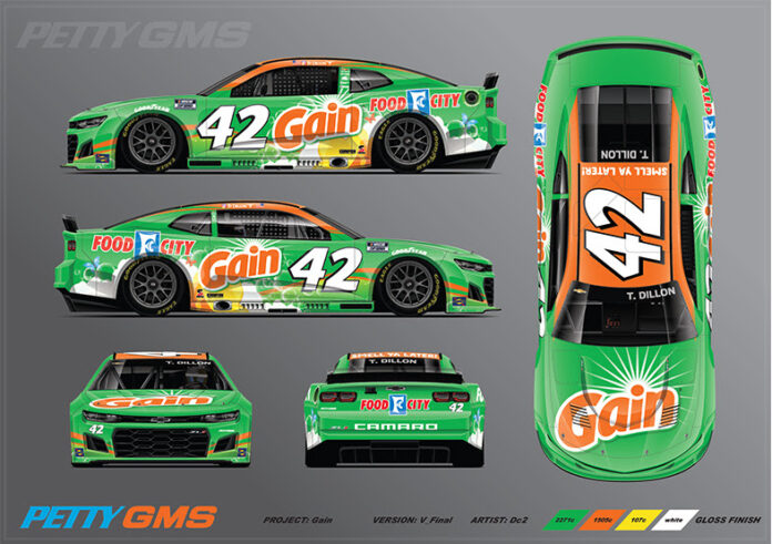 Gain’s bright green-and-orange color palette will adorn Dillon’s No. 42 Chevrolet, marking the brand’s return to NASCAR competition since 2018. The “Smell Ya Later!” design will feature Gain branding on the hood and sides.