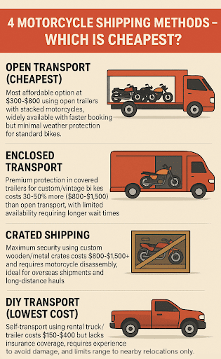 The cheapest way to transport a motorcycle is by using open-air shipping through a motorcycle transport company. Open carriers cost between $300 and $500 for short distances and $600 to $800 cross-country. DIY transport using a rented trailer may cost less, but it increases risk and effort.