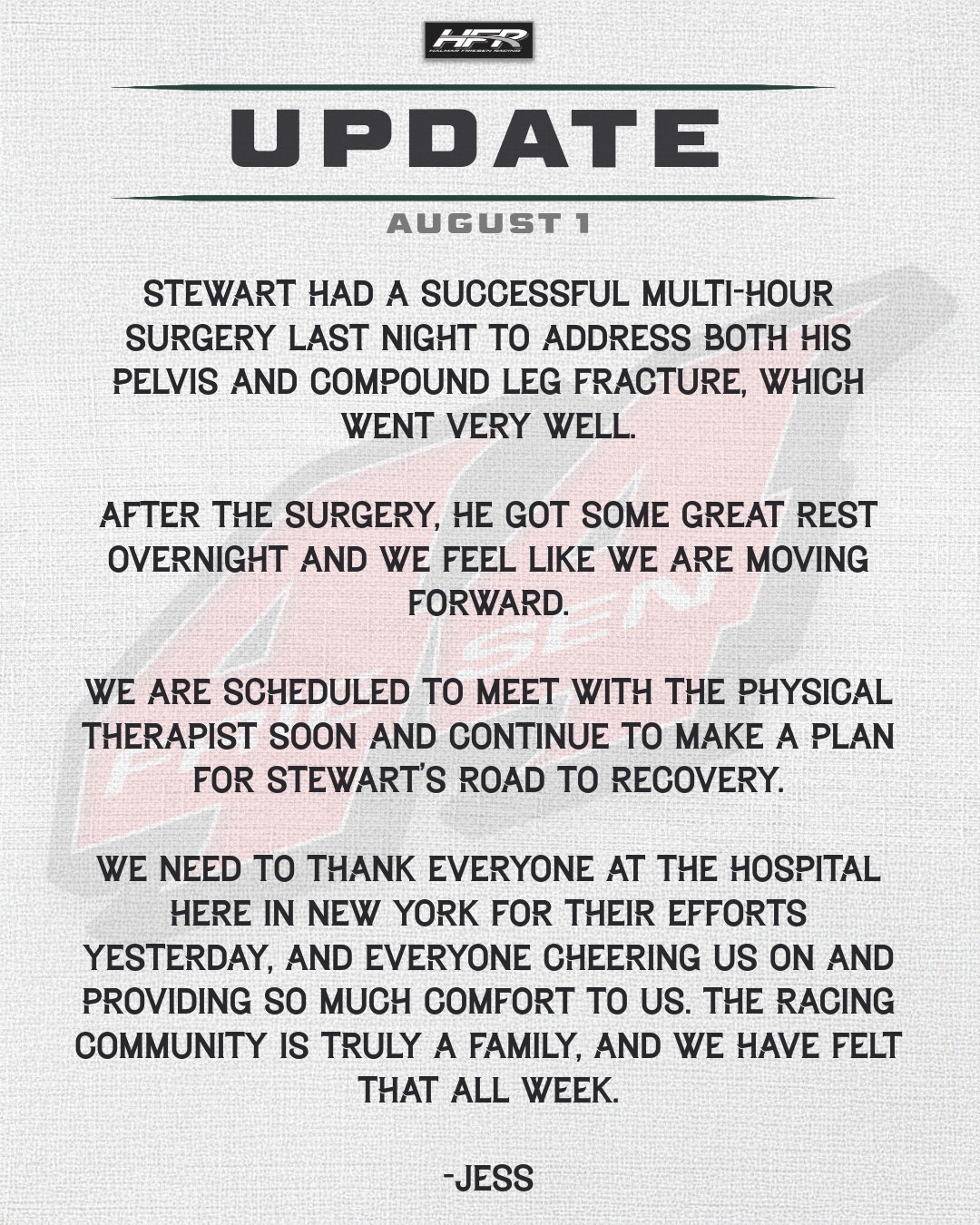 His wife, Jessica Friesen, has been providing updates on his condition through his social media account on X (formerly Twitter). She confirmed that Stewart has fractures to his pelvis and right leg and will require surgery to address his injuries.