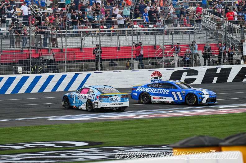 Then after trailing Hamlin from Turn 7 to entering the frontstretch chicane, Chastain sent his No. 1 Busch Light Chevrolet entry into the rear of Hamlin’s No. 11 Progressive Toyota Camry XSE entry. Chastain’s move resulted with both him and Hamlin spinning through the chicane. As Chastain quickly placed his car in reverse to cross the finish line, he was overtaken by Bowman, Stenhouse and Logano.