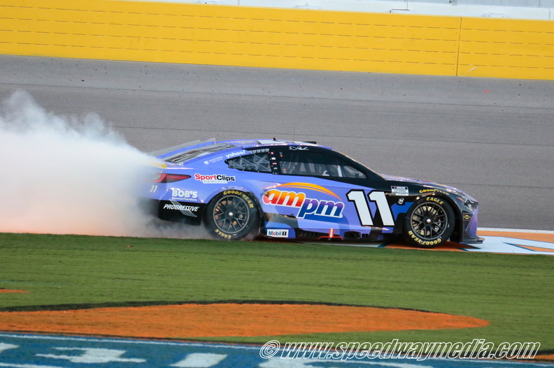 Then with four laps remaining, Hamlin, who reeled in and gained lots of ground on Briscoe from Turns 3 and 4, made his move to Briscoe’s outside through the frontstretch. With four fresh tires working to his advantage compared to Briscoe’s two tires, Hamlin used the outside lane through the first two turns to rocket his No. 11 ampm Toyota Camry XSE entry ahead entering the backstretch. From there, Hamlin proceeded to slowly stretch his advantage as Larson started to reel in Briscoe for the runner-up spot.