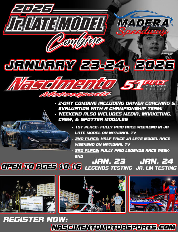 MADERA, CALIFORNIA (December 19, 2025) – Nascimento Motorsports, a championship winning race team in Northern California, has announced the Jr. Late Model Combine to take place at Madera Speedway on January 23-24, 2026. Drivers ages 10-16 years old are invited to apply for consideration for the combine. On-track action on the one-third mile asphalt speedway includes Legends testing on Friday January 23 and Jr. Late Model testing on Saturday January 24.