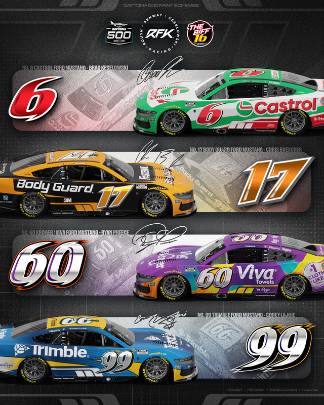 During Daytona 500 activities, RFK Racing will shine a light on Biffle’s unique numeric styling. All RFK Racing Ford Mustangs will each have numerals reminiscent of the iconic font used on Biffle’s cars during his illustrious career.