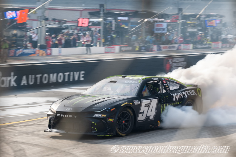 When the white flag waved, and the final lap started, Gibbs was leading by a slim margin over Blaney. Blaney then tried to use the inside lane to motor ahead through Turns 1 and 2, but Gibbs used the outside lane through the backstretch to launch back ahead with the lead. As Blaney tried to mount a final charge from the inside lane through Turns 3 and 4, he got briefly loose entering the frontstretch as Gibbs used both the outside lane and momentum to storm his No. 54 Monster Energy Toyota Camry XSE entry back ahead and beat Blaney by 0.055 seconds.