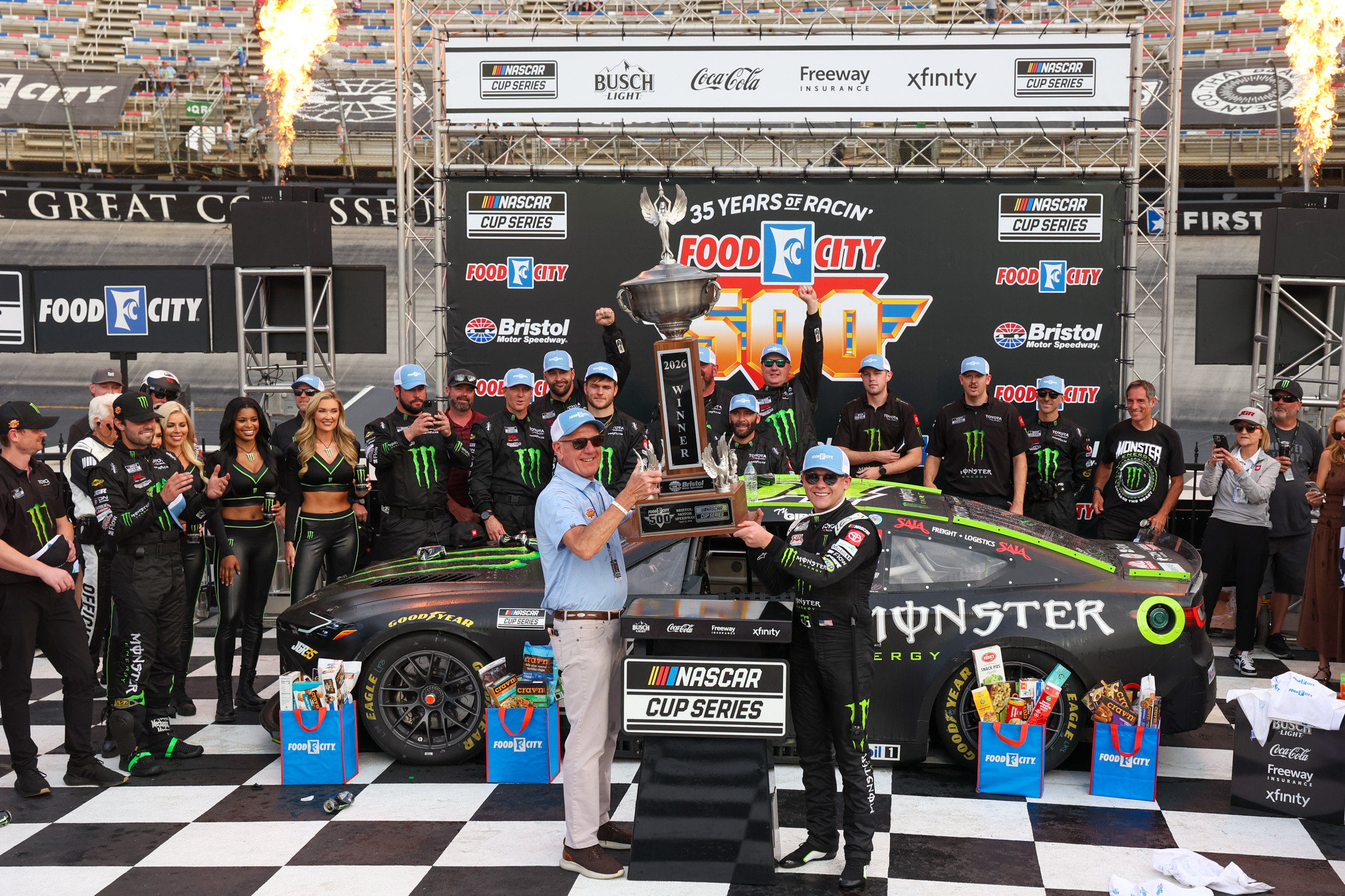 Ty Gibbs capitalized on a late strategic call to maintain track position at the front with worn tires. He withstood an overtime shootout against two NASCAR Cup Series champions, earning his first Cup career victory in the Food City 500 at Bristol Motor Speedway on Sunday, April 12.