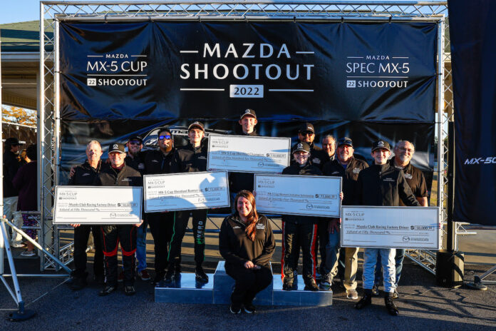 KERSHAW, S.C. (Nov. 29, 2022) – After two days of driving, several meetings and multiple sessions spent reviewing data at Carolina Motorsports Park in Kershaw, South Carolina, three drivers earned scholarships in the 15th edition of the Mazda MX-5 Cup Shootout. Additionally, two karting stars were selected to be Mazda club racing factory drivers.