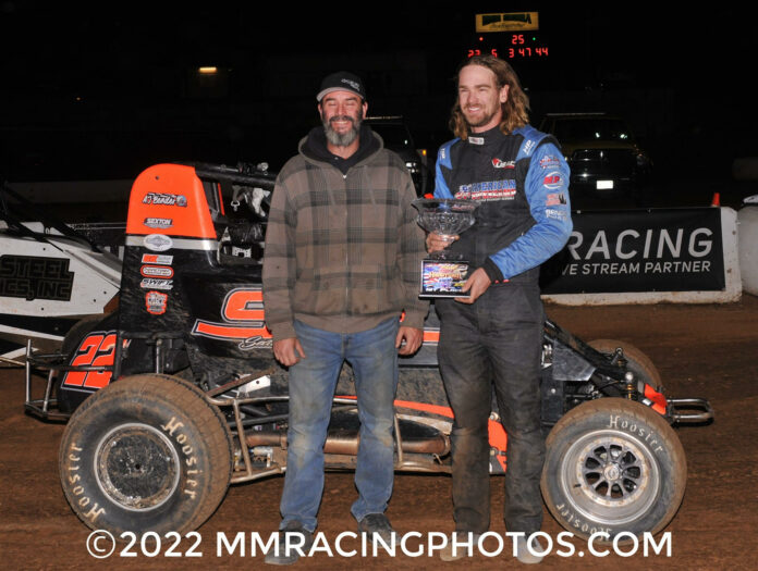 (Torrance, CA, November 22, 2022) In November 2021, San Diego’s AJ Bender came to the “Hangtown 100” and finished second all three nights. Not wanting to face that frustration again this year, Bender scored a convincing win in night #2 of the prestigious lightning sprint car race at the Placerville Speedway last Friday. It was his second victory at the track in 24 hours, and his third on the banked red clay quarter mile in 2022. Overall, it was his fifth lightning sprint car win of the year.
