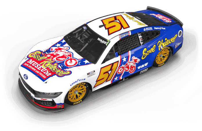“Evel Knievel didn’t just ride a motorcycle – he flew it,” said Ware, owner of the No. 51 Ford Mustang Dark Horse that his son, Cody, drives in the Cup Series. “I remember watching him jump buses, fountains, anything you could line up in front of him, and he made it a must-see event every time. I didn’t just see it on television, I was there. His career was filled with jaw-dropping moments that people will never forget. Being able to promote the Evel Knievel Museum in Las Vegas through our race team is our way of keeping those legendary feats front and center.”