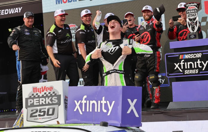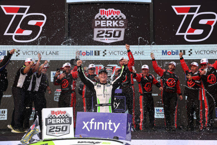 NEWTON, Iowa — Sam Mayer took control of Saturday’s Hy-Vee Perks 250 NASCAR Xfinity Series race at Iowa Speedway after a Lap 221 restart and maintained it the rest of the way to record the first victory for the Haas Factory team and the first in the series for Ford this season.