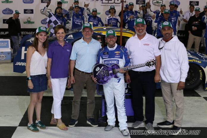 “These [No. 7] guys right here, they deserve this one more than anything,” Allgaier said on the frontstretch on the CW Network. “I screwed them over last week by making a pit call that had equally as good of a car. This Hellmann’s Chevrolet was just absolutely on rails. There’s no cooler feeling than to win at a place like this, Nashville. The fans here are incredible. This race is special to me and I said before the race that I really wanted to get a second [Gibson] guitar for both [of my daughters] to have a guitar. They can fight over both of them or one of them, whatever.”