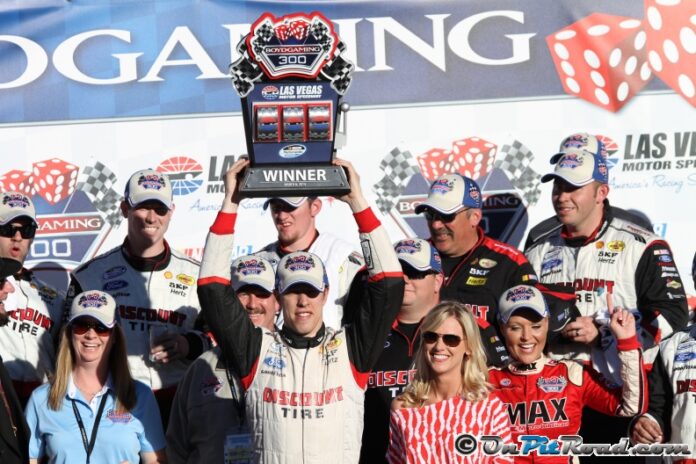 Keselowski, who won yesterday’s Boyd Gaming 300 in the NASCAR Nationwide Series at LVMS, inherited the race lead after Earnhardt’s fuel tank went empty down the backstretch on the white flag lap. Earnhardt was able to continue and finished an acceptable second place, which becomes his second straight runner-up finish.