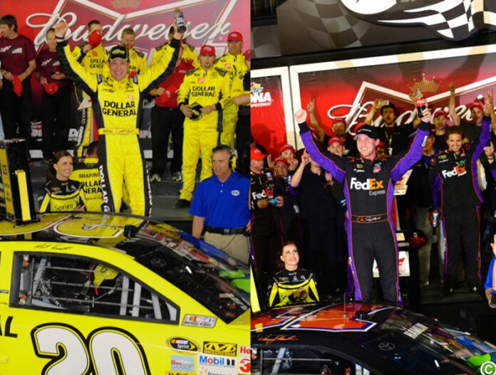 When pit stops were done, Denny Hamlin emerged as the new leader and took control of the race. As the final laps neared the drivers started to jockey for position and it was only a matter of time before something happened. On the last lap Jimmie Johnson was in the outside lane and ran out of gas triggering a seven car pile-up which would send Clint Bowyer upside down but luckily landing on all four tires instead of flipping more. Other cars involved were Michael Waltrip who took a pretty hard hit into the inside wall, Jamie McMurray, Carl Edwards, David Ragan, and Martin Truex Jr. After the smoke cleared Denny Hamlin was declared the winner.